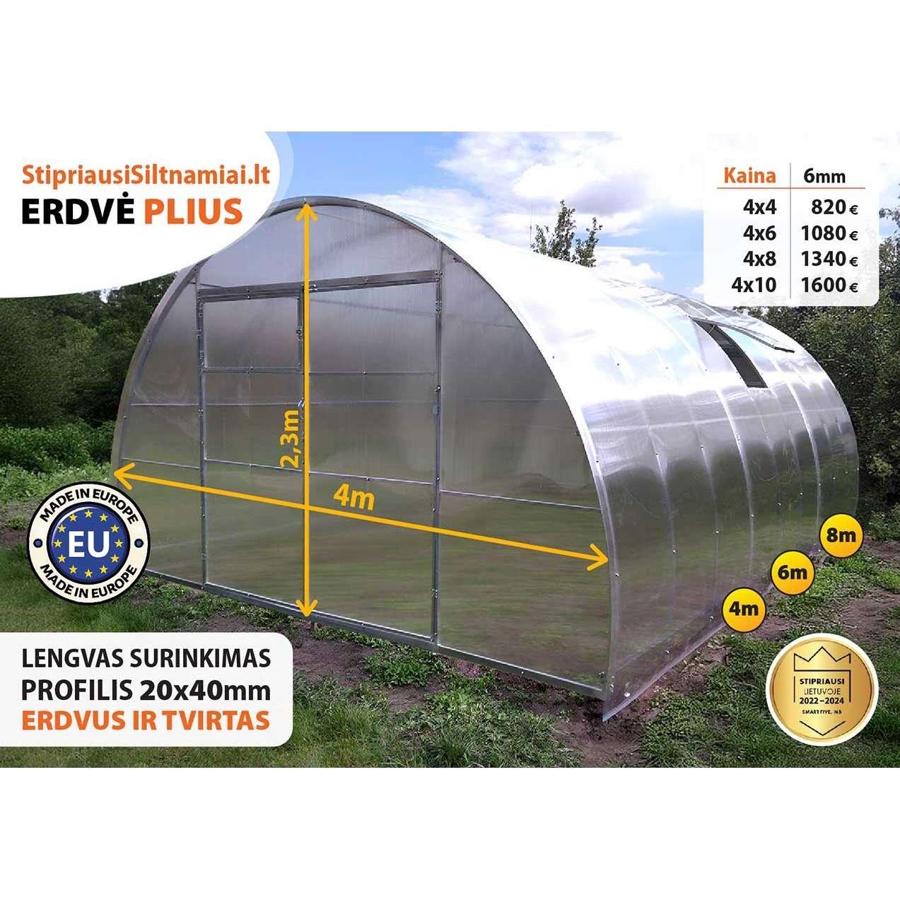 Ieškote pramoninio tvirtumo su maksimalia erdve? ErdvėPlius – 4 m pločio arkinis šiltnamis su 40×20 mm cinkuotu profiliu ir 6 mm polikarbonatu standartiškai. Plačios dvigubos durys (1,94×1,80 m), 2,3 m aukštis ir keturios lysvės su patogiais praėjimais – profesionalaus lygio auginimo erdvė jūsų sklype.