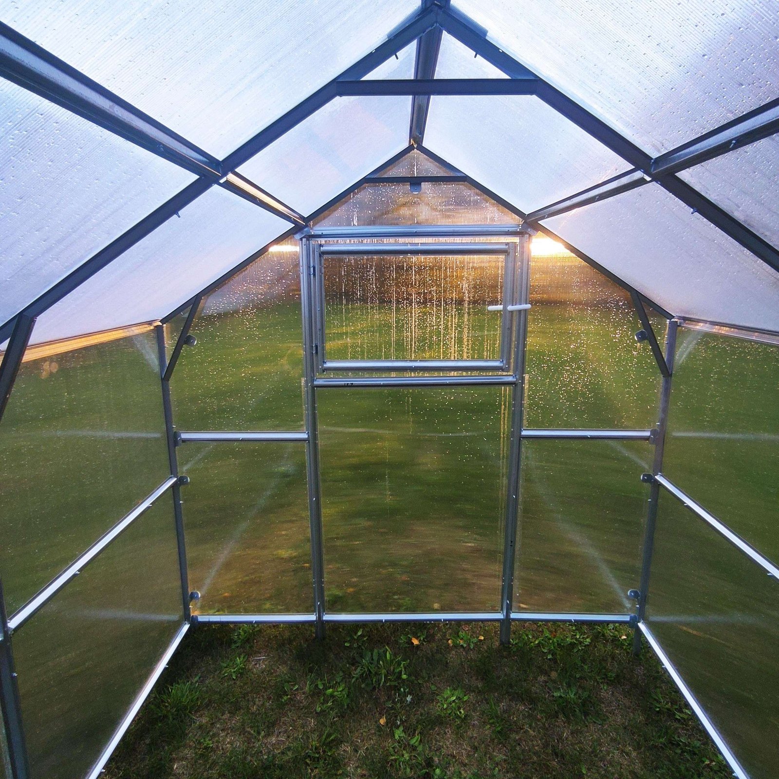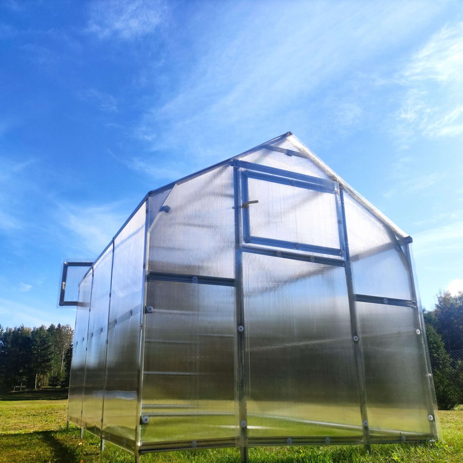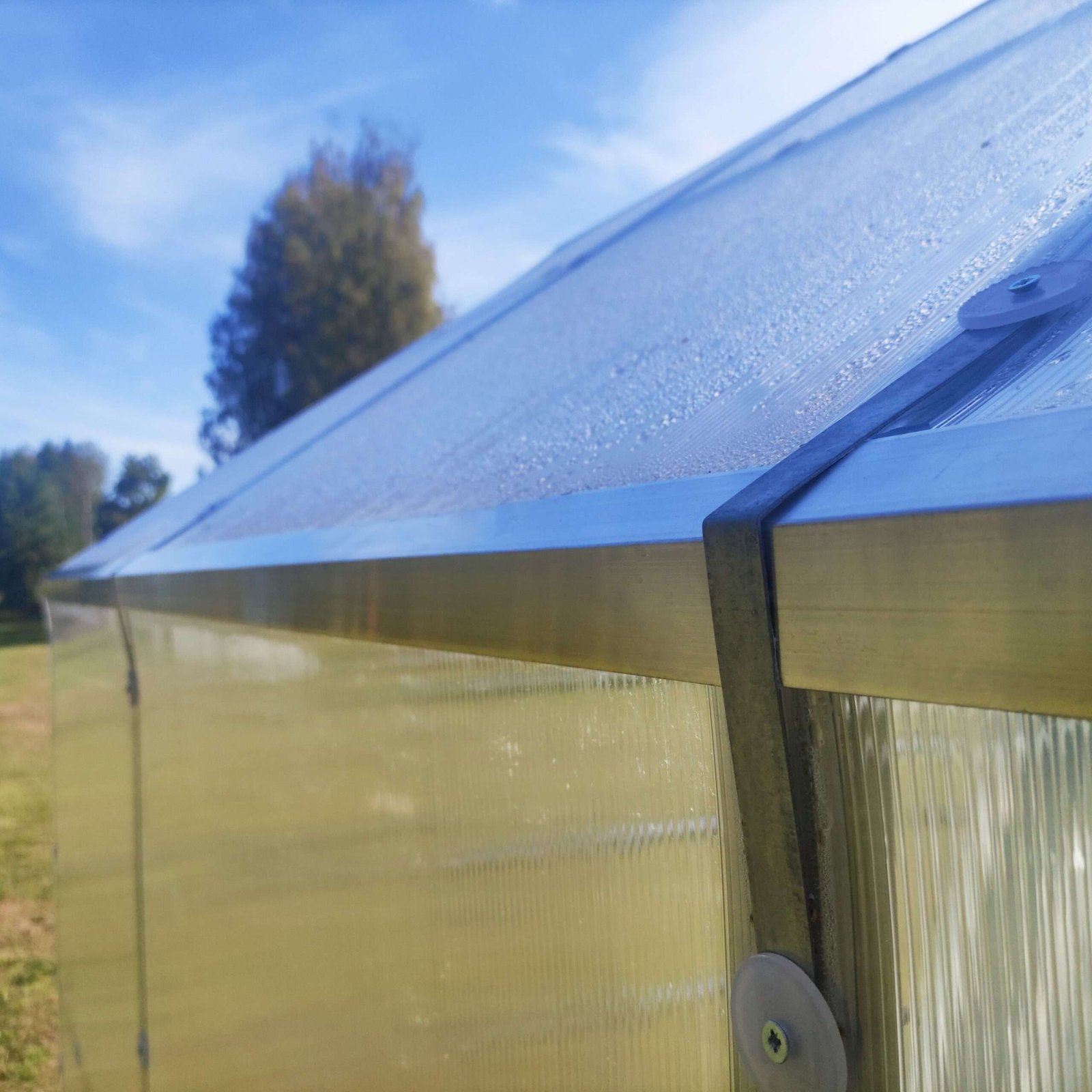 🏠 Dvišlaitė forma – visas plotas išnaudotas Namuko formos dvišlaitė konstrukcija leidžia optimaliai išnaudoti visą šiltnamio plotą. 2,35 m plotis ir 2,35 m aukštis – pakankama erdvė laisvam darbui ir aukštaūgiams augalams. | ✨ Aliuminio kraigas – apsauga nuo drėgmės Specialios konstrukcijos aliumininis kraigas suteikia papildomo tvirtumo ir apsaugo polikarbonato lakštų galus nuo drėgmės patekimo į vidų. Elegantiškas ir funkcionalus sprendimas. |